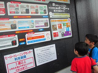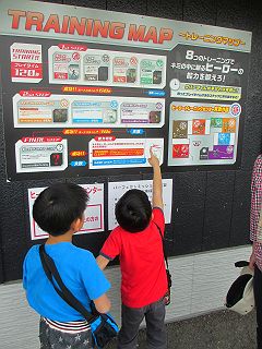 そして、今回一番おもしろかった遊具、トレーニング8! 点いたランプを押したり、サンドバックをパンチしたり、大きな音に驚かないようにしたり、 物陰に隠れて光に当たらないようにしてボタンを押していくような、それぞれのゲームをクリアしていく。 いわゆる、東京フレンドパークみたいなの。