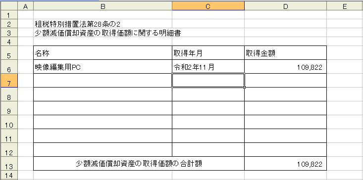 少額減価償却資産 として、取得金額等の記載が必要です。また摘要欄には「措置法28の2 "備品名" 」の記載が必要です。