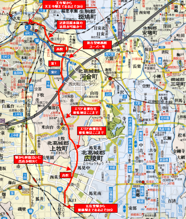 - 対象エリアの南半分は五位堂駅から近鉄経由難波、北半分は王寺駅からJR経由天王寺・大阪へと2分されているため、南半分エリアから王寺駅へ行くこと、北半分エリアから五位堂駅へ行くことは困難である。