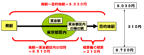 *東京都区内に含まれない東京近郊の駅に行く場合であっても、あえて「東京都区内切符」を買って、出口にある精算機で精算するほうが、直接目的地までの切符を買うよりも安くなる事象が発生します。 |