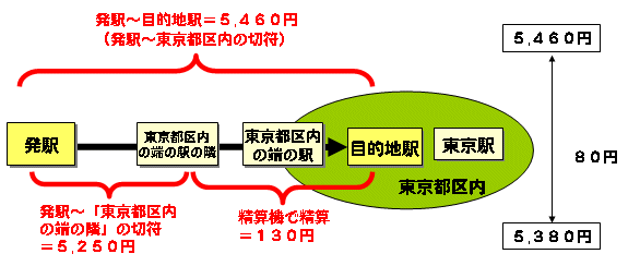 これは、 [発駅]〜[目的地駅(東京都区内)]〜[東京駅] という経路の時に発生します。