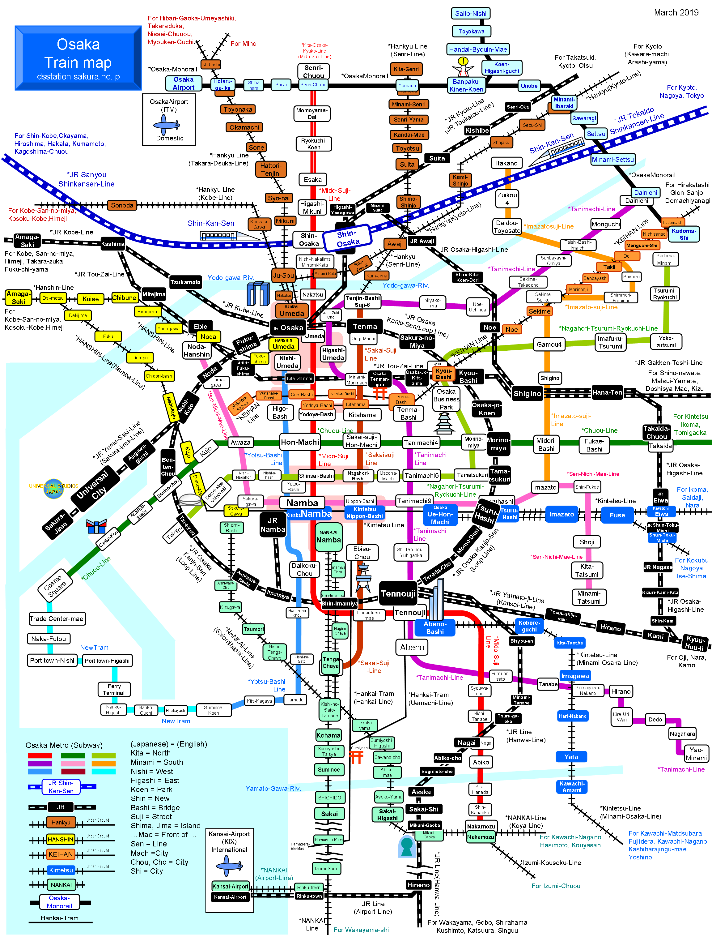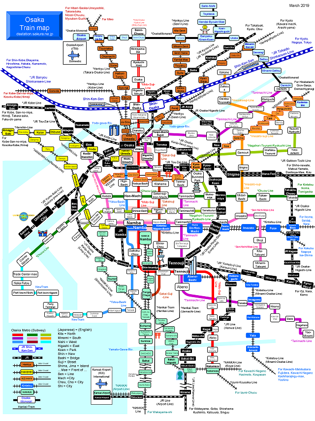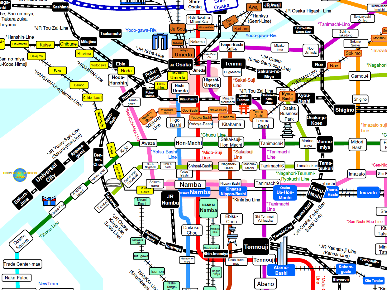 It is a route map (JR, Subway, and Private Railway) in Osaka. => Download [PDF]