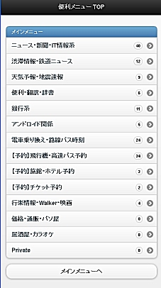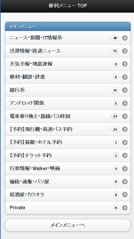 <!〜〜〜〜〜メイン〜〜〜〜〜 > <div data-role="page" id="index"> <div data-role="header"> <h2>【メニュー】TOP</h2> </div> <div data-role="content"> <ul data-role="listview" data-inset="true"> <li data-role="list-divider">メインメニュー</li> <li><a href="#news" data-transition="slide">ニュース・新聞・IT情報系</a> <span class="ui-li-count">40</span></li> <li><a href="#train_news" data-transition="slide">渋滞情報・鉄道ニュース</a> <span class="ui-li-count">12</span></li> <li><a href="#tenki" data-transition="slide">天気予報・地震速報</a> <span class="ui-li-count">9</span></li> <li><a href="#benri" data-transition="slide">便利・翻訳・辞書</a> <span class="ui-li-count">6</span></li> <li><a href="#bank" data-transition="slide">銀行系</a> <span class="ui-li-count">11</span></li> <li><a href="#android" data-transition="slide">アンドロイド関係</a> <span class="ui-li-count">5</span></li> <li><a href="#train" data-transition="slide">電車乗り換え・路線バス時刻</a> <span class="ui-li-count">24</span></li> <li><a href="#bus" data-transition="slide">【予約】飛行機・高速バス予約</a> <span class="ui-li-count">24</span></li> <li><a href="#hotel" data-transition="slide">【予約】旅館・ホテル予約</a> <span class="ui-li-count">2</span></li> <li><a href="#ticket" data-transition="slide">【予約】チケット予約</a> <span class="ui-li-count">2</span></li> <li><a href="#walker" data-transition="slide">行楽情報・Walker・映画</a> <span class="ui-li-count">4</span></li> <li><a href="#kakaku" data-transition="slide">価格・通販・パソ屋</a> <span class="ui-li-count">0</span></li> <li><a href="#izakaya" data-transition="slide">居酒屋・カラオケ</a> <span class="ui-li-count">0</span></li> <li><a href="#private" data-transition="slide">Private</a> <span class="ui-li-count">0</span></li> </ul> <a data-role="button" href="#index"><alt="" border="0" height="" width="">メインメニューへ</a> </div> <p><a href="#about">本ページのご紹介</a></p> <div data-role="footer"> <h4>D's Station</h4> </div> </div> |