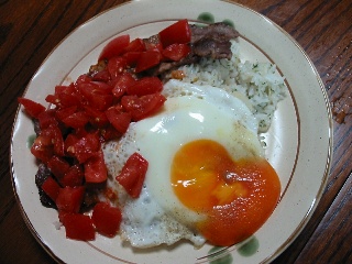 | 5.トマトを細かく切り、塩・オリーブ油で味付けする | 6.3をお皿に盛って1をのせ目玉焼きをのせて、1の上に5をのせて、こしょうをふれば、できあがり |