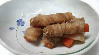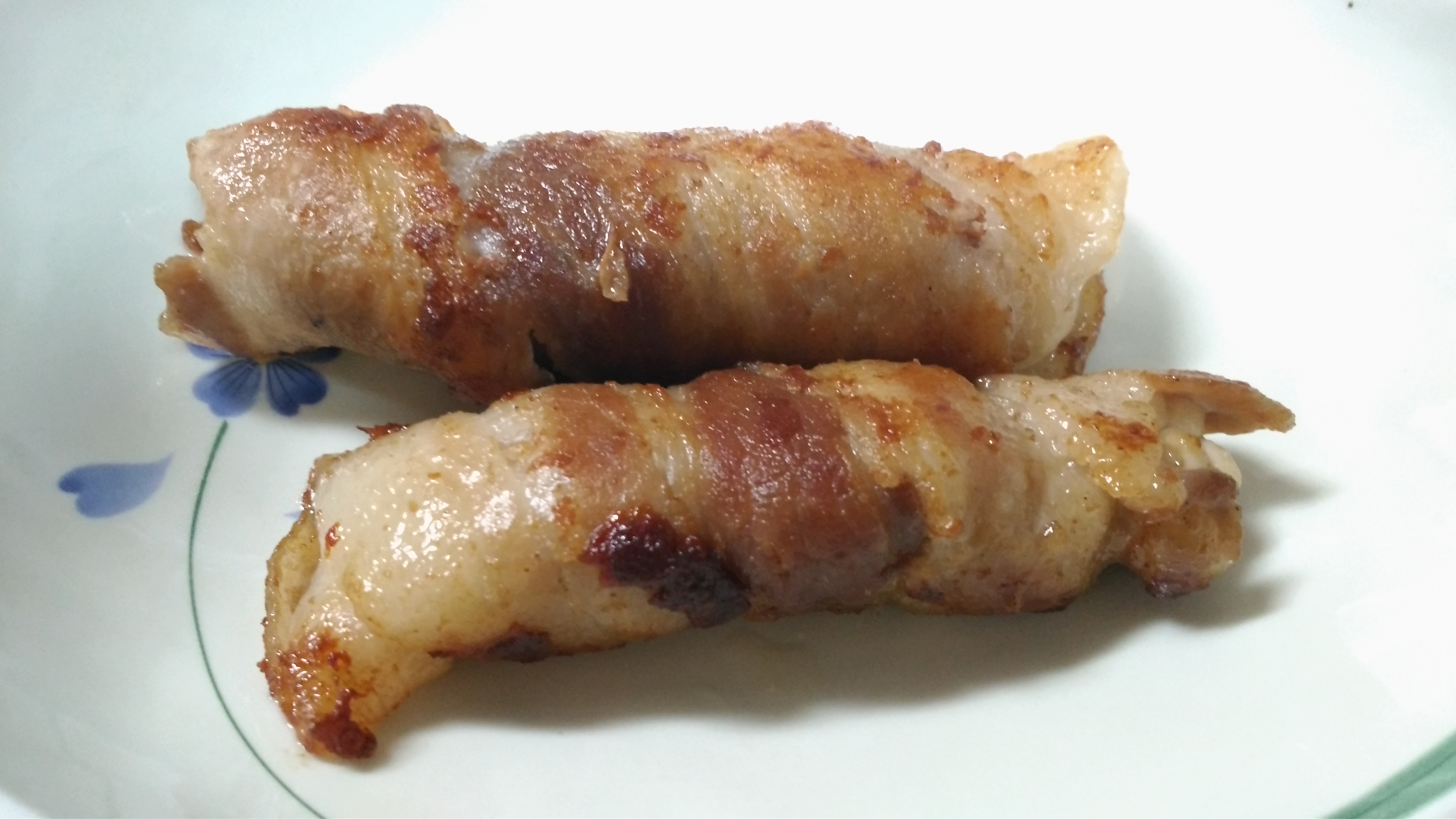 2.豚肉を広げ、その上に1を置いて、肉を端から巻いていきます。