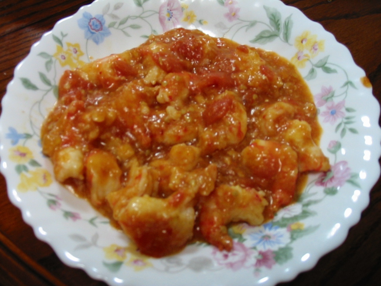 3.2ににんにく・しょうが・豆板醤・醤油・酒・コンソメ・こしょうをいれて、トマトが煮立つまで炒めます。
