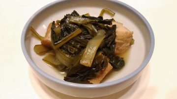 1.油揚げを沸騰したお湯にいれ2分くらいゆでて、油抜きをし、1枚に開いておきます。