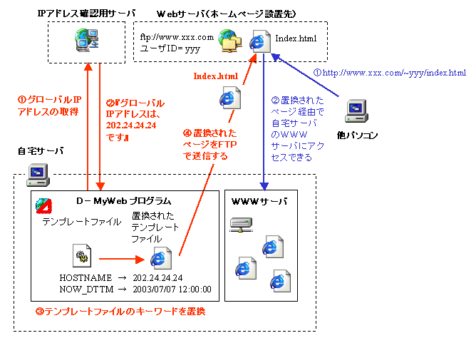 D-MyWeb は、インターネットに常時接続した固定 IP アドレスを持たない PC 上のホームページへのリンクページを自動で生成し、プロバイダ等の Web サーバに定期的に更新することで、実現しています。
