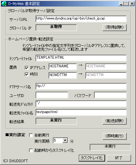 ●テンプレートファイル・置換(IPアドレス、時刻)は、デフォルト設定でOKです ●FTPサーバ名・ユーザID.パスワード・転送先ディレクトリは、ホームページの登録情報に基づいて正しく設定してください ●転送先ファイル名は、問題が無ければデフォルト設定でOKです ●[転送試験] ボタンを押下し、「実行完了」が表示されれば成功です 成功しない場合は、設定内容が間違っているか、サーバ側で書き込みができない状態である可能性があります。一度、ほかの手法(FTPコマンドやFTPクライアントプログラム)を用いて接続、ファイルの転送ができるか試みてください。 実行設定 ●一定周期で自動的に実行したい場合は、「自動実行」にチェックをして、「実行周期」を設定します ●起動しても、画面に表示せずタスクトレイにのみ表示する場合は「起動時からタスクトレイ化」をチェックします |