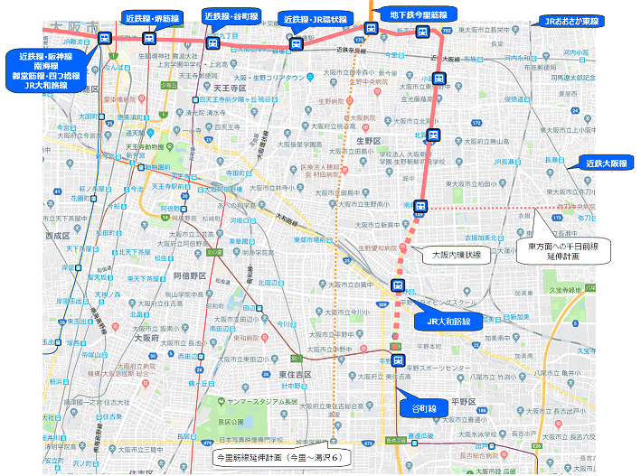 一方、大阪メトロ「今里筋線」の今里から湯沢6丁目交差点までの延伸計画もあります。