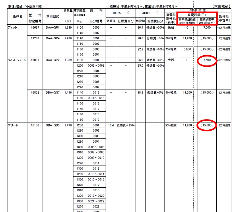 例えば、フリードで、車両型式がDBA-GB3の場合(15,000)と書いてあります。つまり重量税は15,000円となります。従来は 24,600円していたので、約10,000円程度減税になっています。