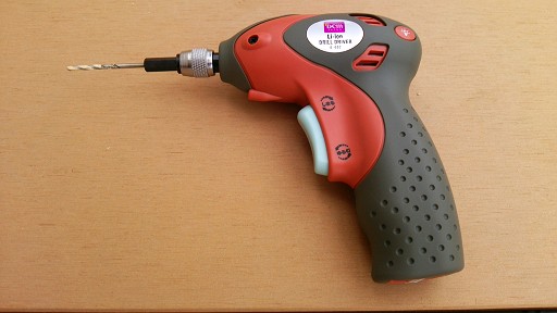 電動工具でねじをいきなり取り付けると、木が割れてしまう可能性があるので、まずはドリルで穴をあけておく。