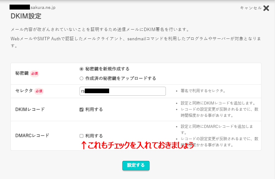 DMARCレコードの「□ 利用する」にもチェックを入れて、「設定する」のボタンを押します。