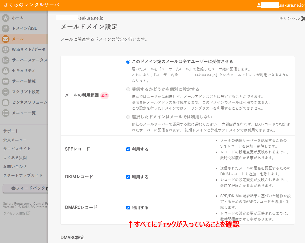 と、言っても、さくらインターネットではかなり簡単に設定ができるようになっており、さくらインターネットの「サーバコントロールパネル」にログインをして、<ドメイン設定>で、SPFレコード、DKIMレコード、DMARCレコードを「利用する」という設定にチェックを入れることで対処できます。(これまでは、SFPレコードの設定だけでよかったのですが・・・)